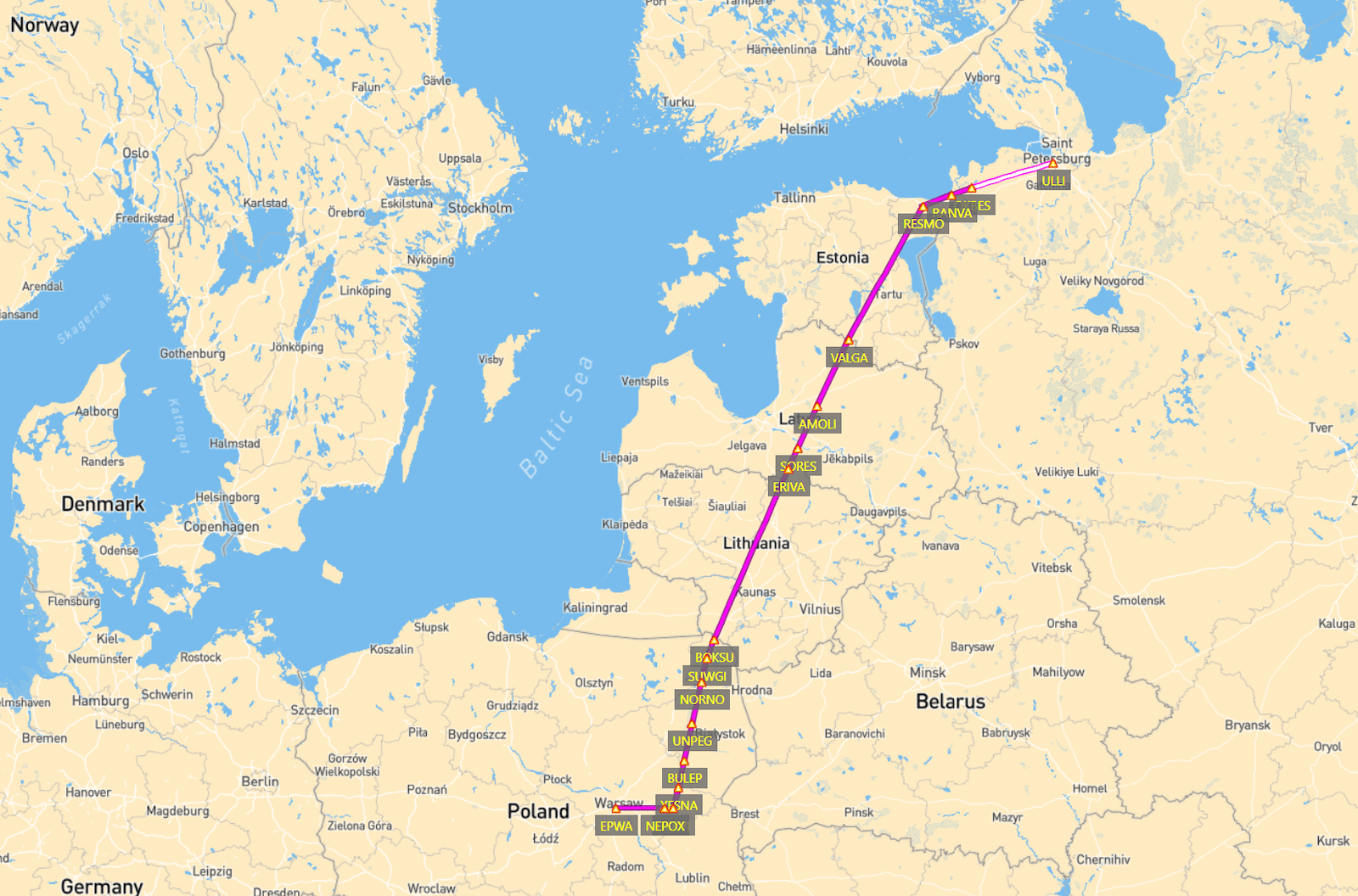 | Route & Distance | ULLI F360 TURAL1B TURAL L870 RESMO DCT VALGA M985 SUWGI M857 GERVI P851 NEPOX NEPOX5U EPWA [641 nmi, 1188 km] |